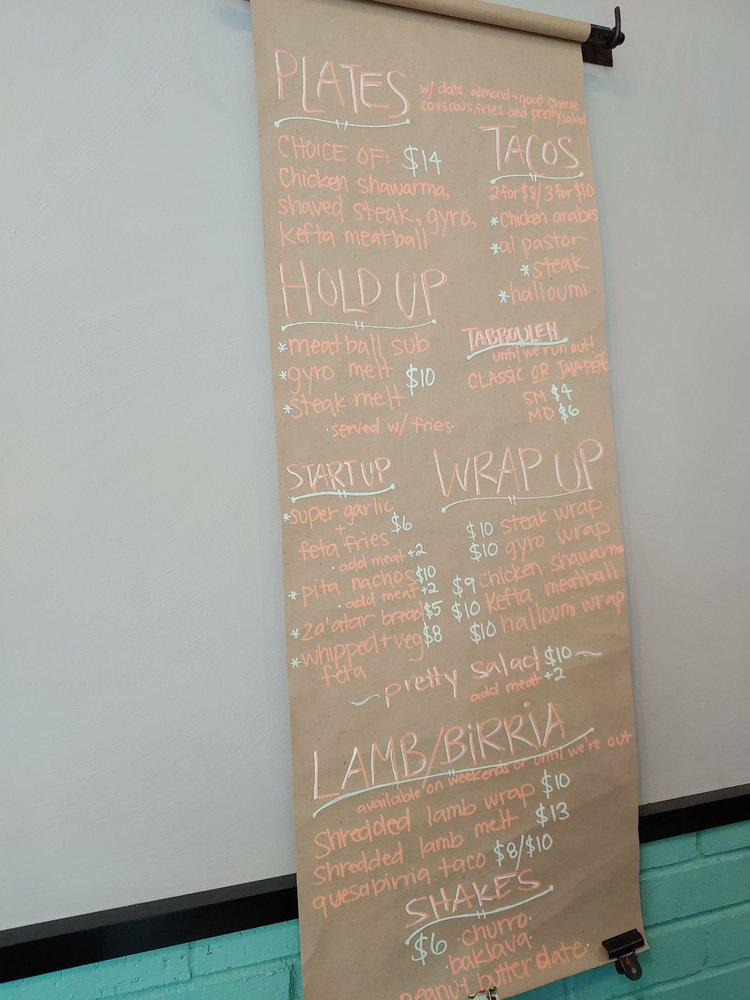 Chicken halloumi gyro- Flour tortilla with Chicken Shawarma, onion, radish, cucumber yogurt and whipped feta, jalapeo tabbouleh. Steak - shaved ribeye steak, onion, radish, cilantro, American cheese
